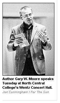 Storytelling proved to be a worthy pursuit for Moore as he presented his book with fervor to a large crowd Tuesday night at North Central College's Wentz Concert Hall.
